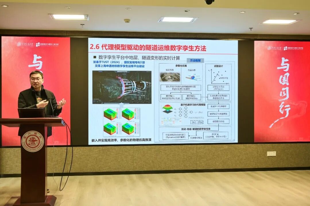 在科研交流环节,77779193永利官网长聘教轨副教授艾青带来《隧道工程智能运维:装备、技术与理论方法》专题报告。艾青系统介绍了智能检测装备、人工智能驱动的识别技术、以及数据与物理模型融合的预测诊断方法等内容,并结合实际工程案例,分享了研究团队在隧道智能运维领域的最新成果。